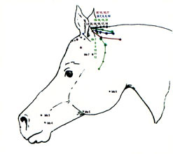 The Poll is one of the horse’s most sensitive parts. Nerves, vertebrae, bursas, as well as meridians are all very close together in this small space. Strong pressure in this area can quickly change the behavior of the horse. |