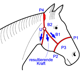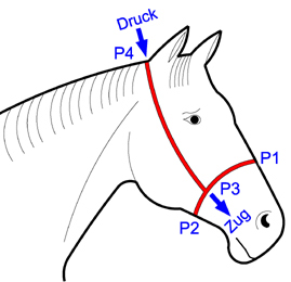 With a regular bridle there is a thin strip of leather from the noseband that runs over the poll. Most times the noseband is fastened so that it lies firmly on the horse. Because the horses head is wedge-shaped, when the horse chews or moves his jaw, the noseband inevitably slides down. The pressure on the poll therefore increases. Between P1 and P2 is a curved line. P3 is the highest point. When the horse opens his mouth the curve between P1 and P2 is straightened. Through this action there is a pulling force on P3 towards the horse’s mouth that creates a right-angles bearing on P4, increasing the pressure on the horse’s poll P4.